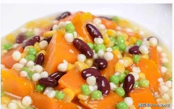 材料:老南瓜、红芸豆、芡实、青豆、玉米粒、素汤、盐、香菇精、玉米淀粉水、香油