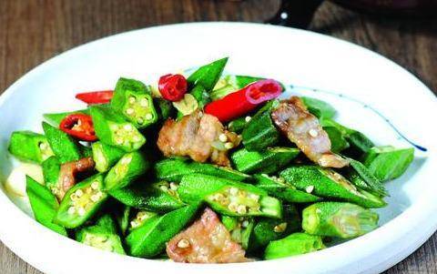 4.起锅,加入适量油,爆香葱姜干辣椒;然后加入肉片翻炒;肉片炒好后,放入秋葵,放少许盐快速翻炒均匀,关火,加入鸡精,淋上香油即成。