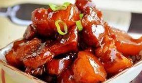 4、锅留底油,下葱姜蒜片炒香,加入肉丁翻炒变色,加入甜面酱,炒香,放入炸好的鱼块,加料酒、糖、生抽、蚝油和适量的水;用大火煮,然后调成中火煮15分钟,直到锅中的汤变稠,可以从锅中取出。用青葱装饰在盘子里。