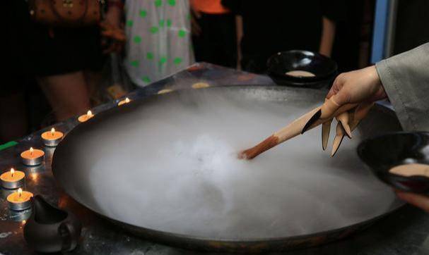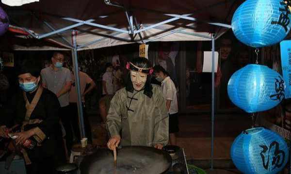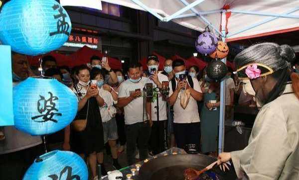 在河南郑州,一个带着鬼魅面具穿着陈旧具有年代感衣服装扮成“孟婆”的模样,在大锅里搅拌着白色汤水,大锅中冒出如梦如幻的白色烟雾,像极了“孟婆汤”的样子。据说,喝下一碗“孟婆汤”,能够让人忘记烦恼和痛苦。该“孟婆汤”其实是最为普通不过的苦丁茶,加上一点特效更显得“玄幻”的感觉。
