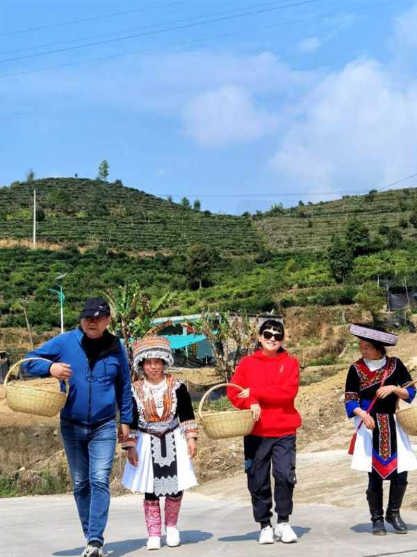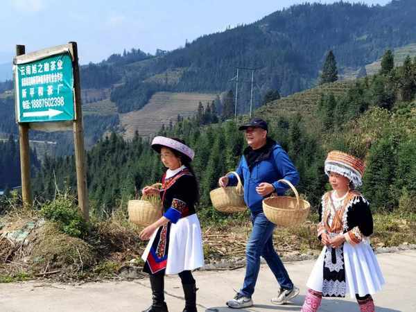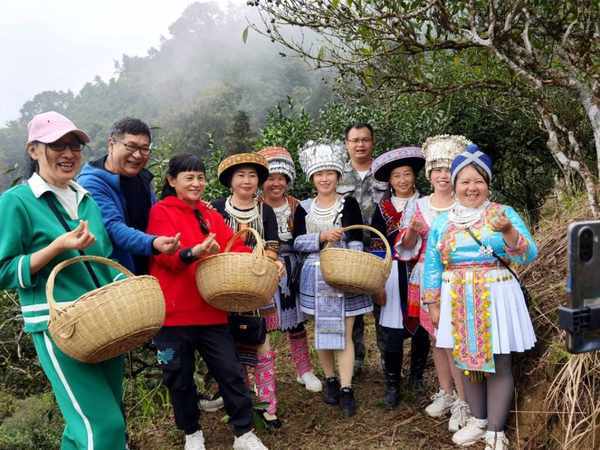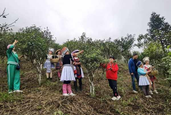 3月17日,在云南省麻栗坡县猛硐瑶族乡的老山山脉上,麻栗坡县陶阿哥种植养殖专业合作社的茶农陶旭(左二)正在指导来自北京的品茶爱好者在百年古茶树上采茶。
