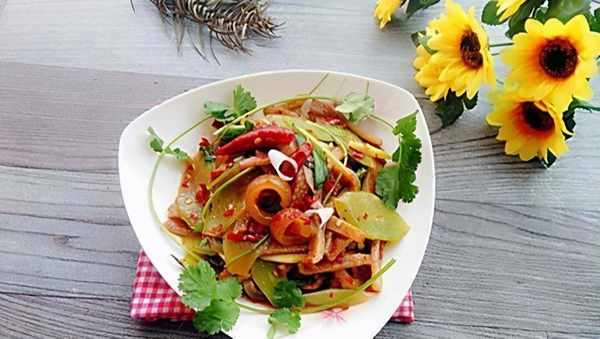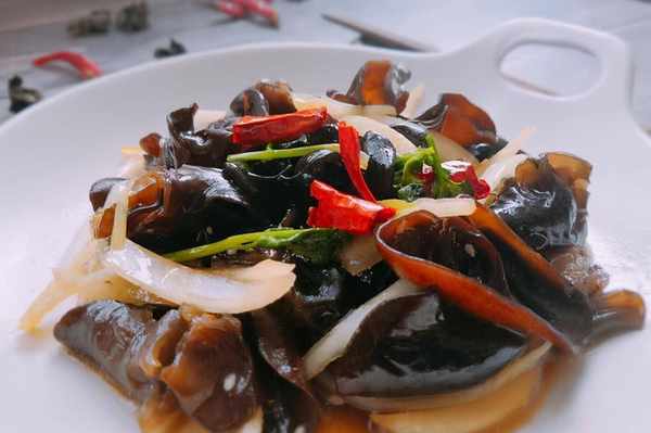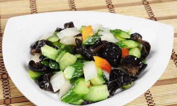 配料:黑蘑菇10克、黄瓜1条、白萝卜半根、胡萝卜半根、大蒜1头、植物油4茶匙、盐1/4茶匙、酱油3茶匙、醋2茶匙、1.5茶匙糖