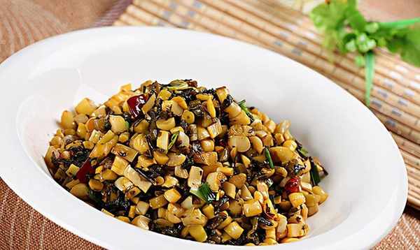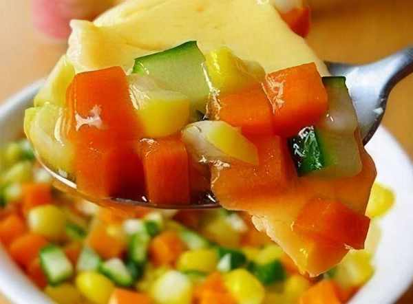 3、将玉米、四季豆和胡萝卜片放入热锅中炒熟,收干后加少许水撒上香油,蒸好的蛋液,加半勺酱油,直至加入切好的蔬菜。油炸后装罐头