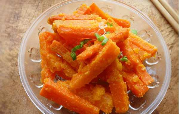 5.炒锅倒入油,倒入蛋黄,小火煎至出现大量气泡,加入胡萝卜条搅拌均匀,让每根胡萝卜条都粘在蛋黄上,可以稍微加一下盐和生抽的量来调整口味。