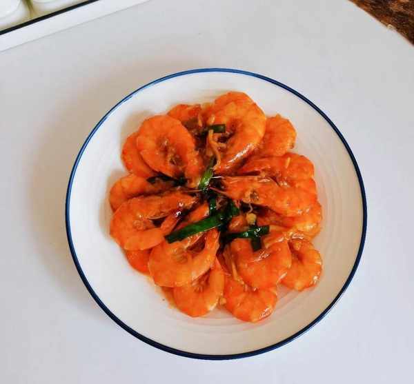 3、然后倒入虾仁,稍微炒一下,加入1勺盐、1勺糖和2勺番茄酱,炒匀,收汁撒上葱花。
