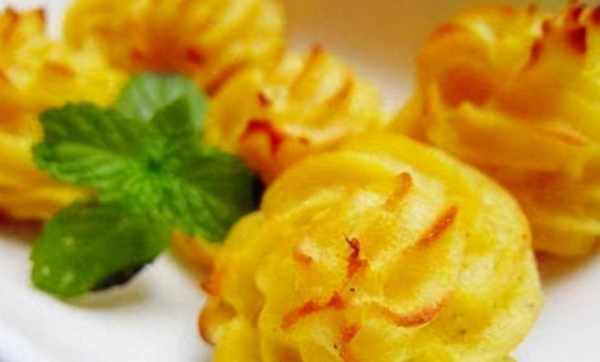 2、将蛋黄加入土豆泥中,再加入黄油、适量的盐和黑胡椒粉,拌匀,用管子挤成小圆塔状。
