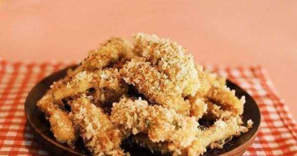 4、杏鲍菇蘸好面团后,沾上面包屑待用。