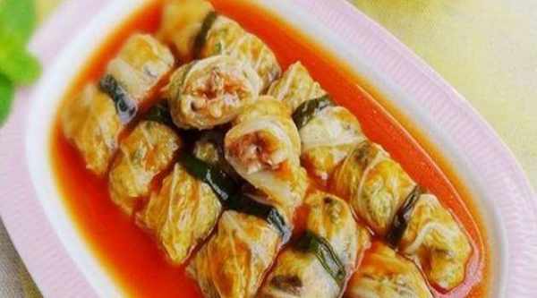 8、取嫩菜叶一片,放入肉馅包好,用韭菜叶扎好。