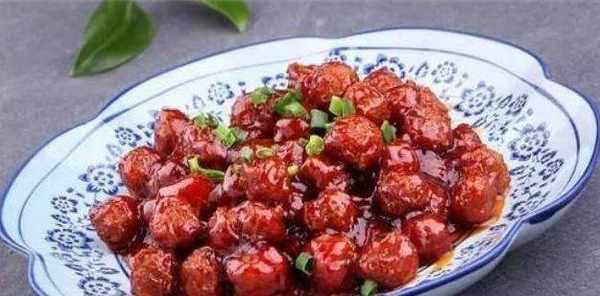 3、炒锅烧热,加入酱汁,放入炸好的丸子,大火烧开后转中火炖5分钟;加入适量水淀粉,大火勾芡。