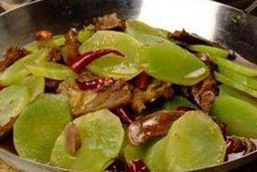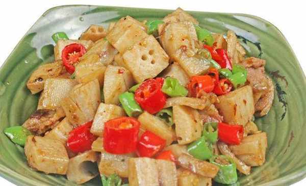 3、锅中放入茶油,70%热时,放入干椒节、川豆瓣酱和姜末用小火翻炒,再加入生菜片和鸭干片,翻炒2分钟,加入鲜汤煮5分钟,加盐、味精、酱油、蒸鱼酱调味,放入干锅上桌。