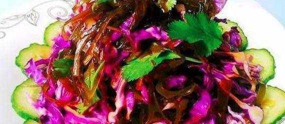 材料:干海带30克,黄瓜半条,紫甘蓝2片,香油,香菜,醋,酱油光,香油,香菜,醋,酱油光。