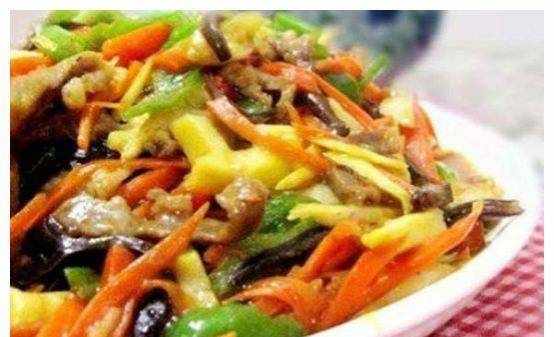 7.加入胡萝卜、春笋、香菇和辣椒翻炒