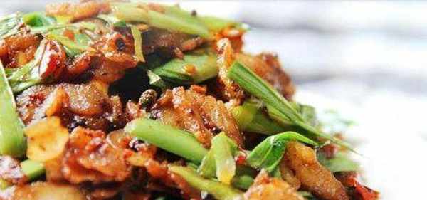 2、将煮熟的肉捞起,过凉水冲洗干净,切成薄片,要薄。当我切割它时,我尽量保持在0.15厘米左右。蒜苗洗净沥干,切成3厘米的段;