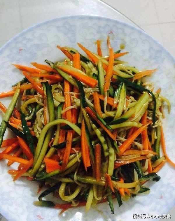 原料:金针菇1小把、黄瓜1条、胡萝卜半根、盐5克、味精3克、酱油5克、米醋10克、苦油10克、3克、5克克芝麻油我