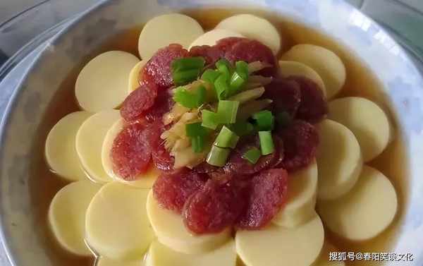2.将日式豆腐、香肠、姜依次摆好;然后淋上生抽。