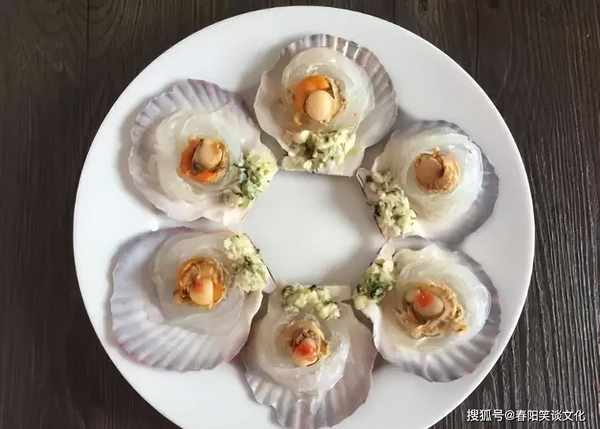 3、将切好的扇贝肉放在粉丝上,每只扇贝均匀倒入少许米酒,铺上准备好的蒜茸。