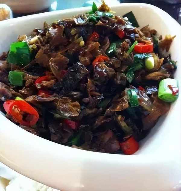 5、肥肠皮拌匀,肠皮微弯发黄,出油,捞出备用。