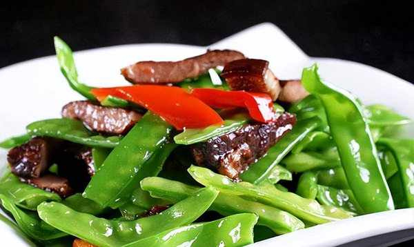 1.豌豆去筋洗净。取出种子,洗净一个大红辣椒。煎一块培根。生姜一片,大蒜一片洗净。