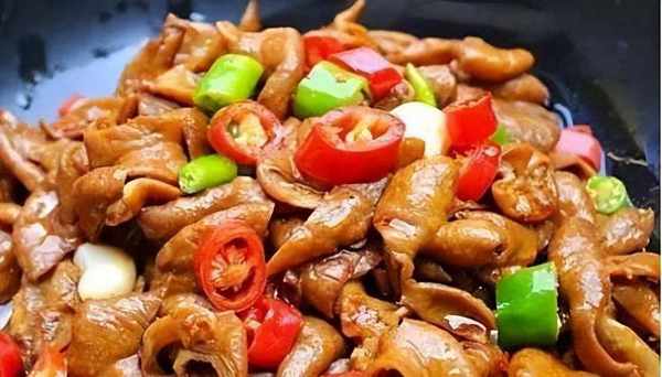 原料:肥肠1000克,红青椒各50克,植物油、红油、精盐、味精、蚝油、豆瓣酱20克、辣椒酱15克、香油3克、5酱油、白酒、八角、桂皮各8克,葱、姜、蒜各5克,干辣椒25克,鲜汤500克