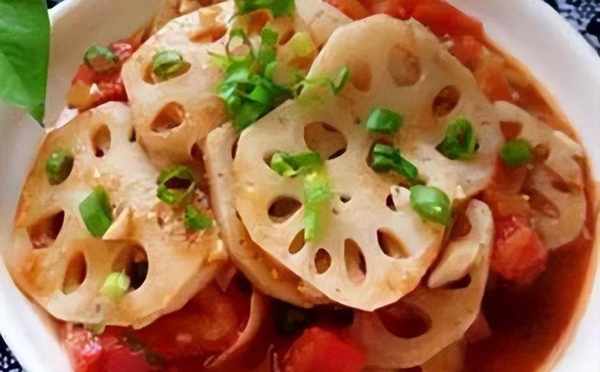 2.热锅冷油,加入葱末和姜末爆香;加入番茄酱翻炒;倒少许水;加糖煮一分钟;加入莲藕片炒熟;