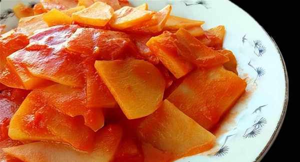 4.汤快没了的时候,加入桃子和胡萝卜拌匀。