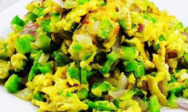 3、锅里倒入底油炒辣椒,加白糖、白醋炒熟,加盐调味,再倒入鸡蛋液炒熟。