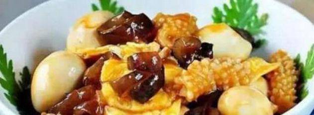 4.加入海参、鱿鱼和鹌鹑蛋翻炒均匀。