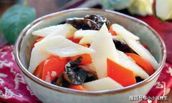 黑蘑菇和山药是对身体有益的成分。黑菇降血脂解毒,山药健脾。混合并加入红辣椒装饰。光是看着就会让人想吃。