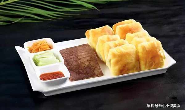 5、点菜时取250克熟牛肉片装盘,配上自制酥饼10个、海地蒜蓉辣椒酱各50克、小葱、酸菜。将配料放入饼干中并食用。