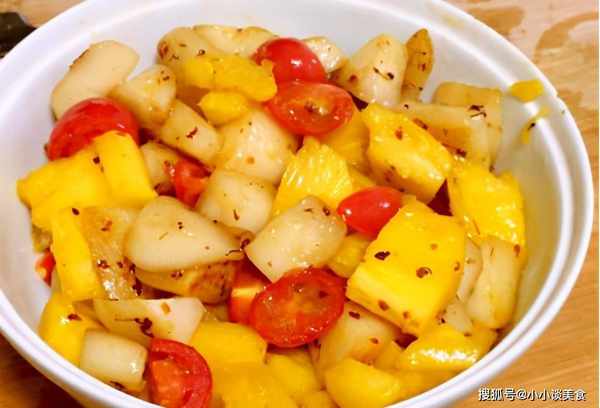 材料:菠萝100克,年糕150克,韭菜几根,盐适量