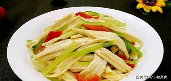 2、炸好后捞出肚皮,继续在锅中用油煎豆腐干。待干豆腐皮冒出白色气泡;