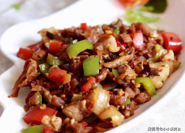 3.大火翻炒至熟,加入盐、蔬果粉和素蚝油,拌匀即可起锅。烧肉切丁配外婆的菜