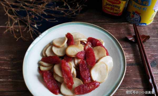 原料:杏鲍菇300克、香肠2根、花生油适量、精盐1汤匙、美极鲜汁适量、葱、姜各5克