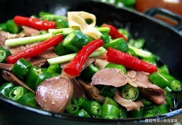11、鸡肉煮熟后,将青椒切成盘状,加入少许味精,炒至生时关火。