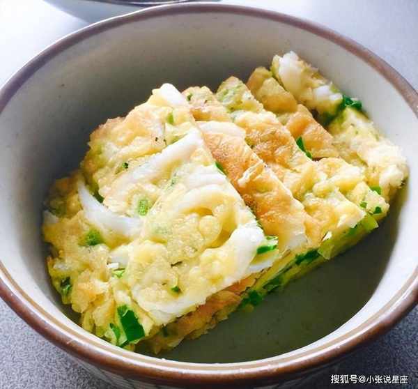5.平底锅坐上中火倒入油,倒入鸡蛋液,小火慢慢煎。一面焦黄后,翻过来煎另一面,煎至熟。