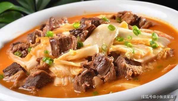 4、将切碎的牛胸肉放入锅中,用文火炖一个小时左右,盖上辣白菜再煮十分钟,也可以加入胡椒粉、香菜、洋葱等。