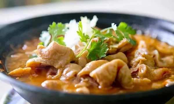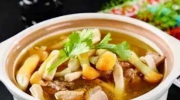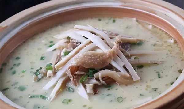 2.将切碎的鸡肉和笋片一起放入锅中,加入预先煮沸的骨头汤,一起煮1小时,加入少许盐,撒上葱花。