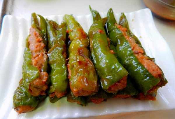 2、锅中倒入植物油,将青椒炒成虎皮状。此时可以在油中加入更多的油,剩下的倒入辣椒面中,制成辣椒油。