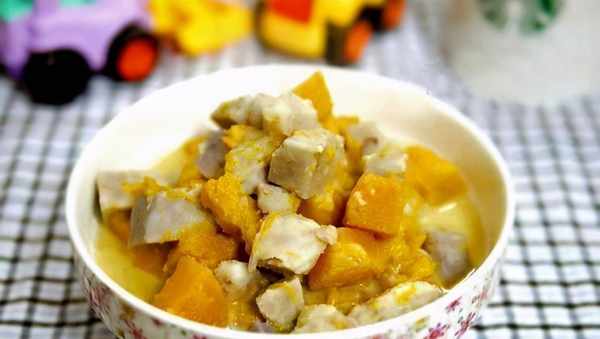 材料:南瓜300克、芋头200克、雀巢淡奶油1/4盒、椰汁1盒、盐2克、玉米油2汤匙