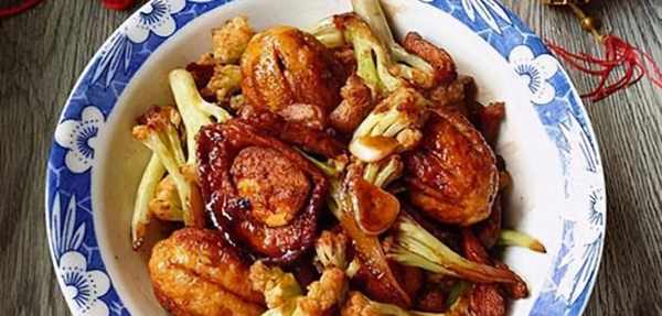 8、锅洗净,倒油,爆香葱蒜,再放入有机菜花,炒至软变色,加盐,倒入熟肉炒出香味