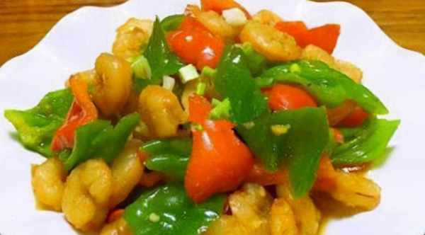 材料:青椒一个,红椒一个,虾仁200克,盐少许