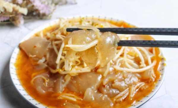 3、锅内放油烧热,放入切碎的辣椒和牛肚翻炒,加入料酒、鸡高汤、生抽、精盐、鸡精翻炒。