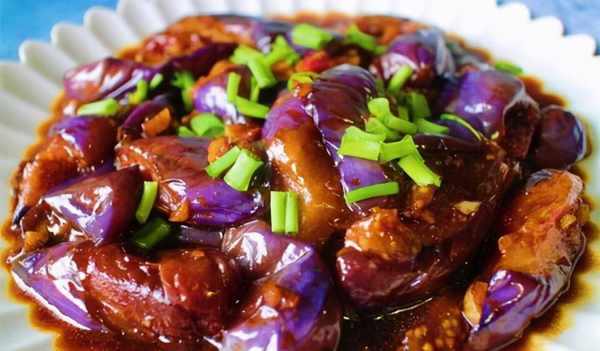 材料:茄子(紫皮)、小葱3个、麻油适量、酱油适量、盐适量、糖适量