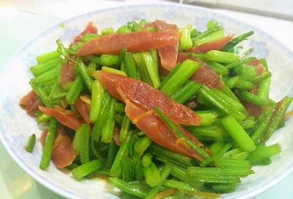 4、加入鸡精和芹菜拌匀,然后用湿淀粉勾芡,淋上香油即成。