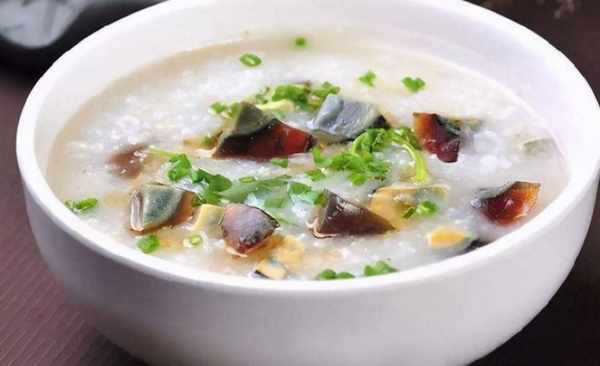 2.锅内放足量水,烧开后加入米饭、皮蛋1个、瘦猪肉煮姜末。大火煮20分钟,中间不时搅拌一下,撇去浮沫,小火煮粥约1-1.5小时至浓稠。