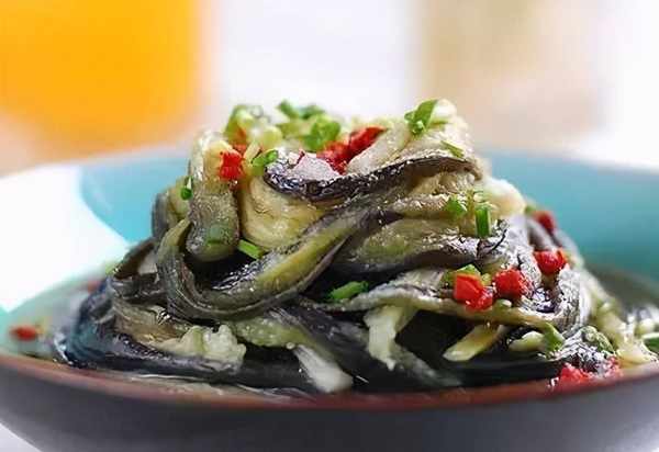 2.将煮熟的茄子晾凉,撕成长条装盘;
