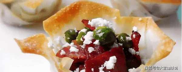 材料:云吞皮、核桃、红枣、培根、豌豆、盐、橄榄油、苹果醋、feta cheese