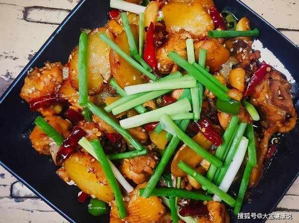 2、净锅里放菜油烧热,先下姜片、大蒜和土鸡块,煸炒出香后,加盐、酱油、花椒水继续炒,待掺入适量清水烧开后,改小火烧至鸡肉入味,这时才把干土豆片和粉条下锅同焖,放盐、味精炒匀后,待锅中汁水将干,撒入青红尖椒节,炒几下便可起锅装盘。
