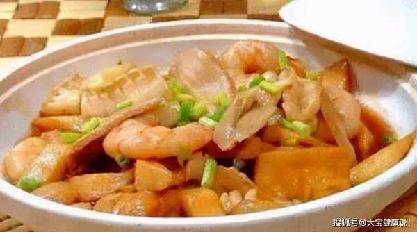 材料:虾肉60克,鲍片40克,鲜鱿80克,茭白200克,油炸豆腐100克,冬笋片50克,烹调油适量,清水适量,大蒜30克,姜片6克,蚝油20克,酱油10克,绍酒15克,鸡粉2克,白糖10克,胡椒粉少许