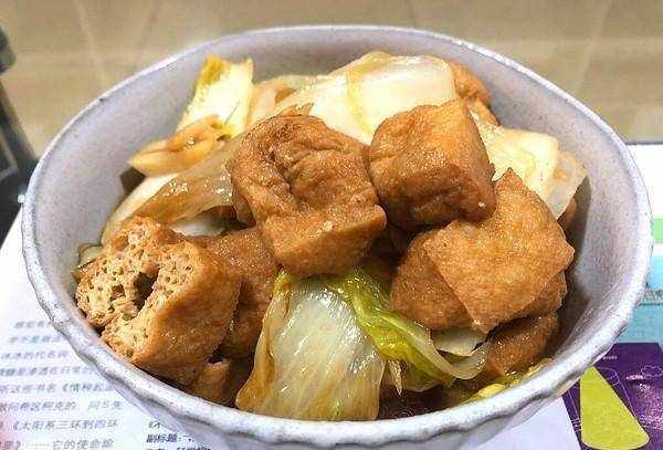 2.将冻好的炸豆腐沥去多余的水分备用。